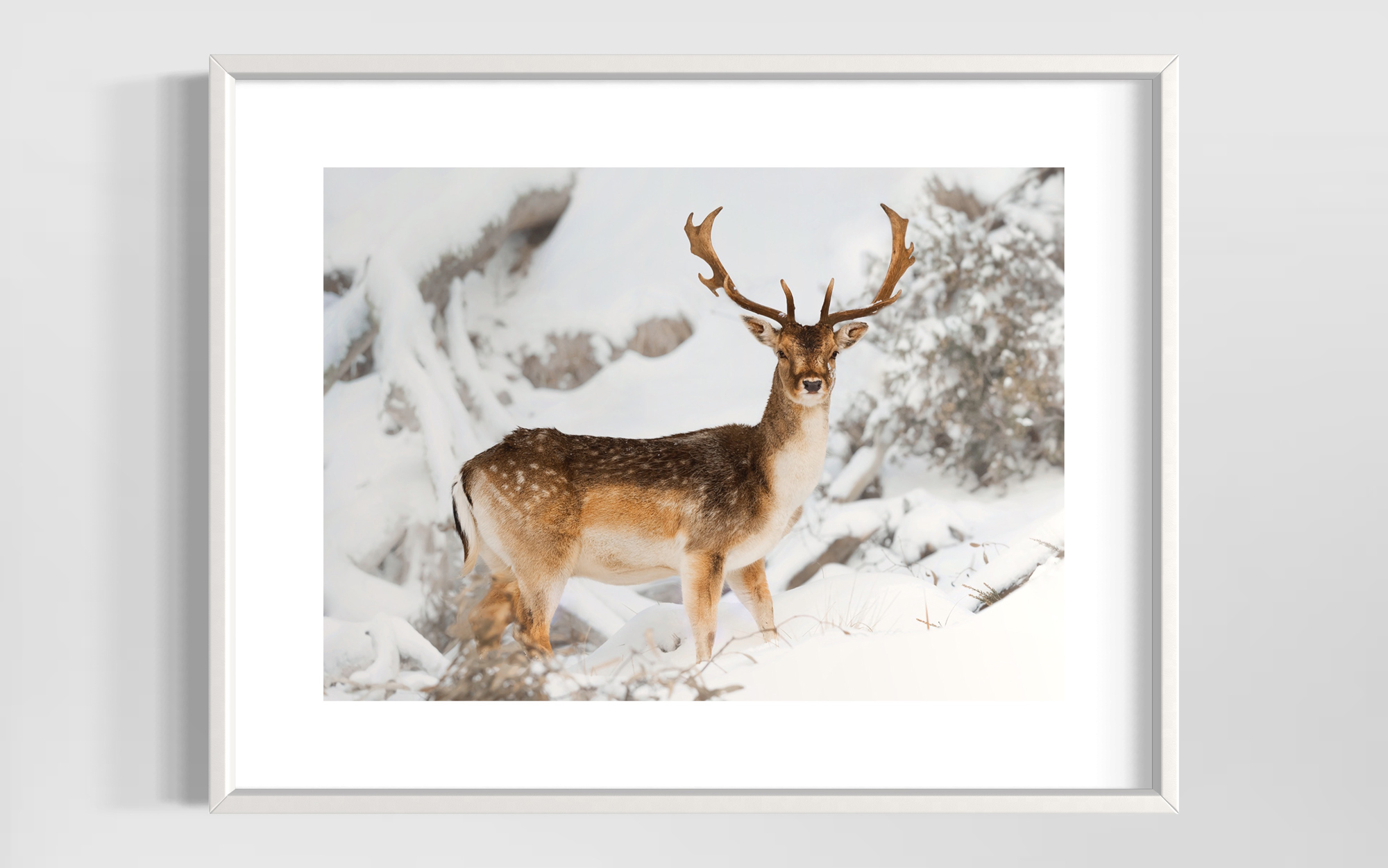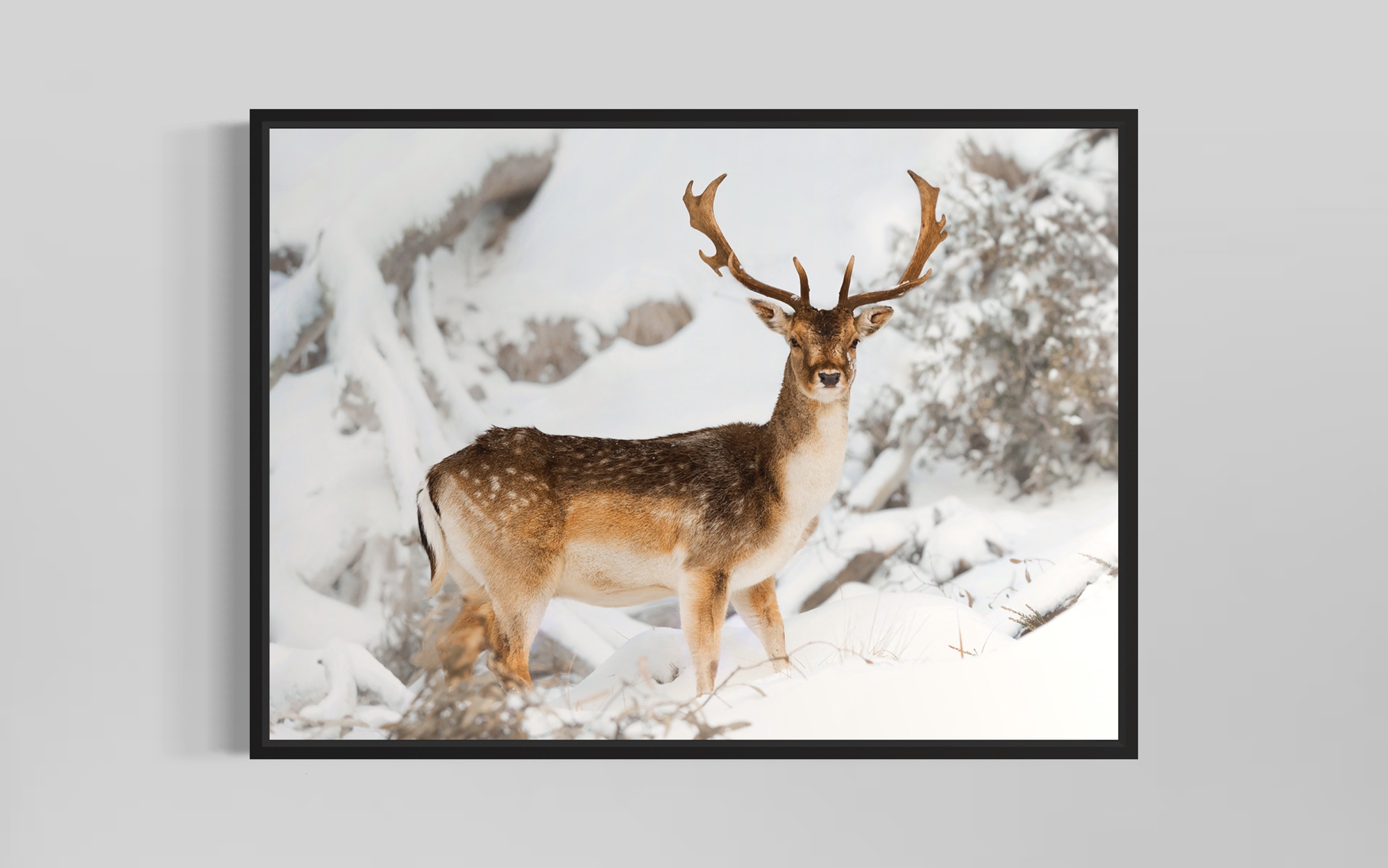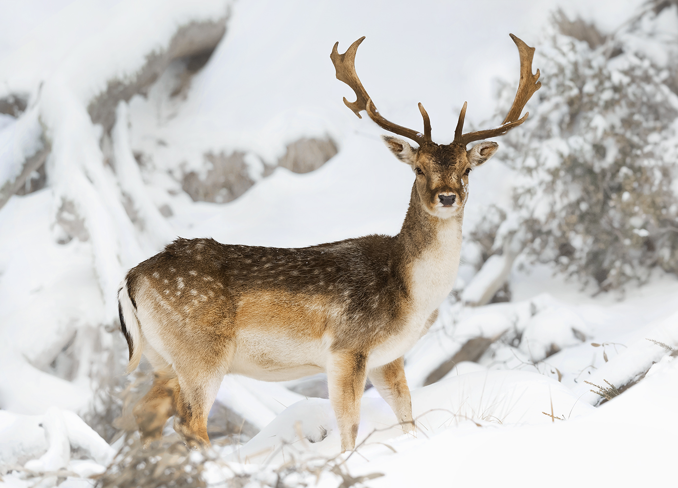 A shy and timid deer stopped to check out the light ruffling noises made in the snow by a man with a camera.