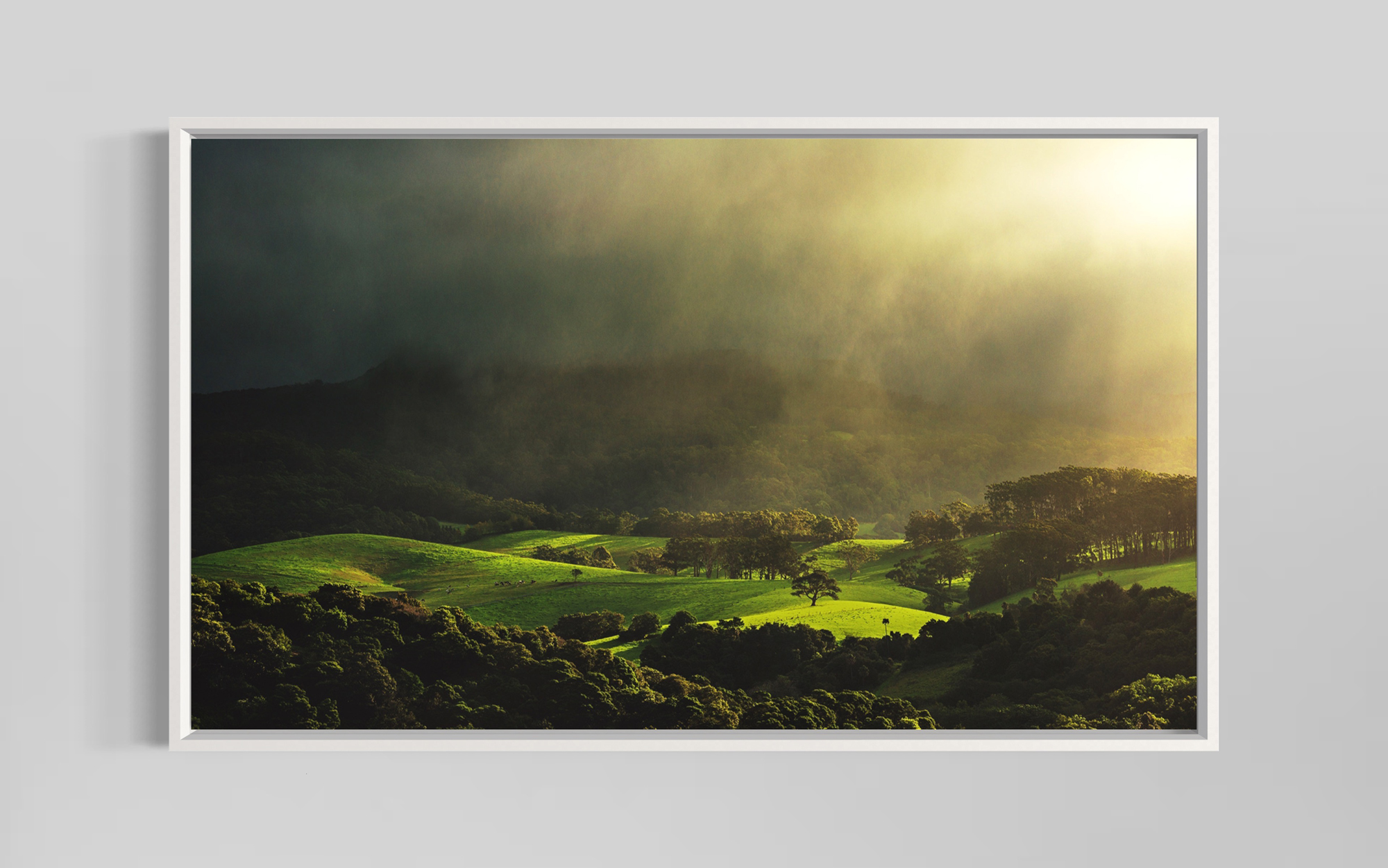 The late afternoon sun and light misty rain cast a soft pattern of light over the lush green hills.